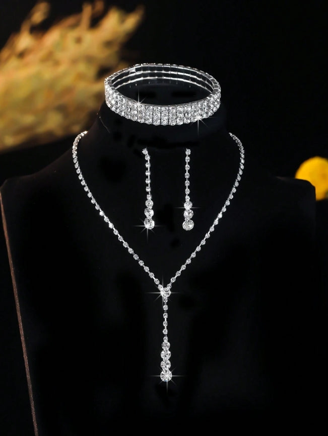 Adaugă un strop de eleganță ținutelor tale cu acest set rafinat de bijuterii format din colier, brățară și cercei. Realizat cu pietre strălucitoare și detalii delicate, setul este perfect pentru ocazii speciale precum nunți, petreceri sau seri de gală.