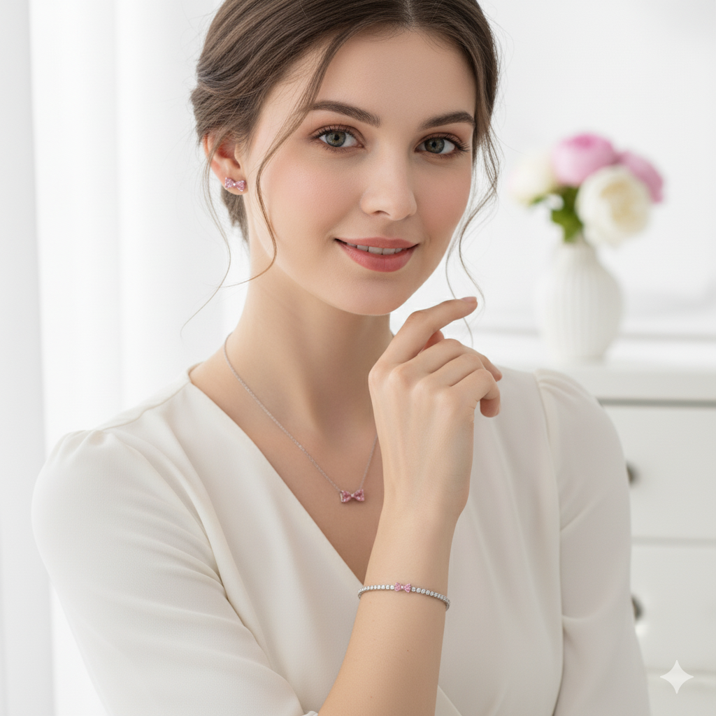 ✨ Set bijuterii din argint 925 și oțel inoxidabil – Pink Bow Elegance ✨