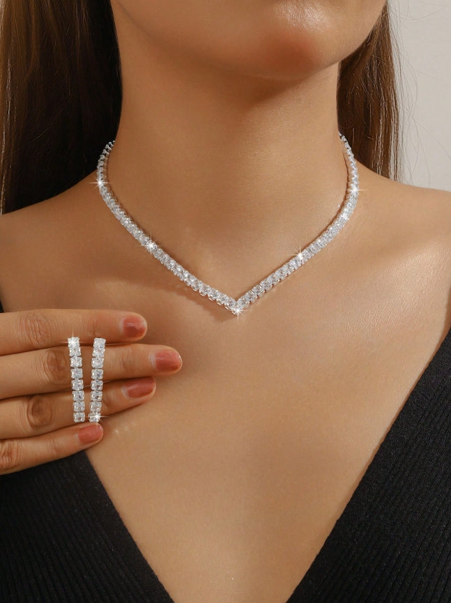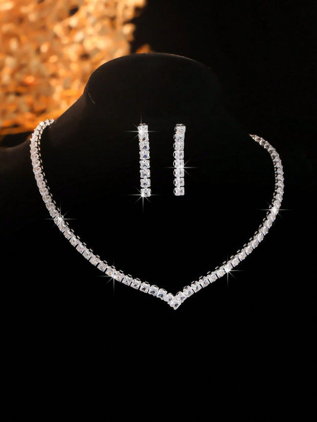 Adaugă un strop de eleganță ținutelor tale cu acest set rafinat de bijuterii format din colier și cercei. Realizat cu pietre strălucitoare și detalii delicate, setul este perfect pentru ocazii speciale precum nunți, petreceri sau seri de gală.
